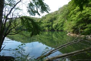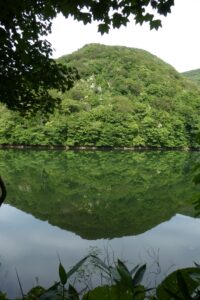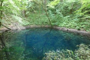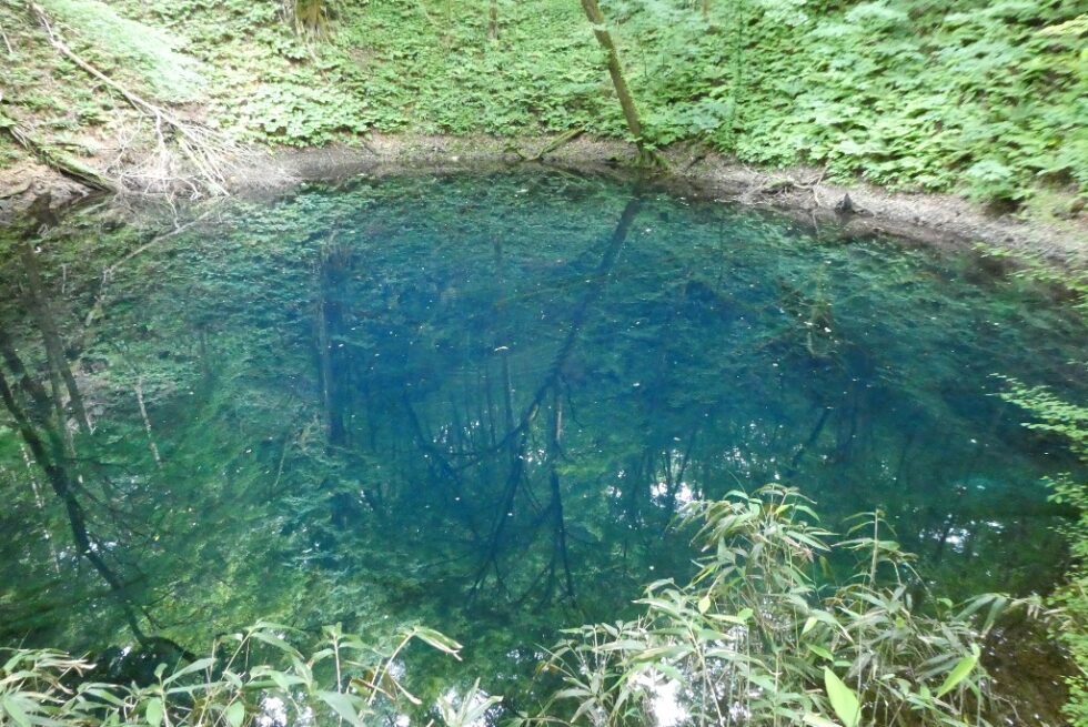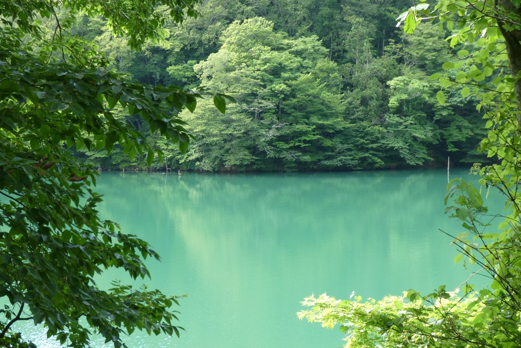 白神山地の一角にたくさんの湖沼が集まっている場所があり、十二湖と呼ばれている。そのうちのひとつ青池は透明度が高く青く澄んでいる。