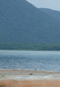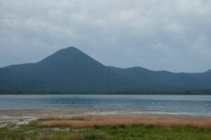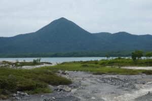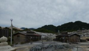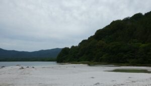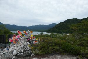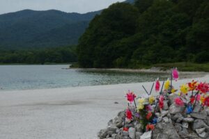 カルデラ湖である宇曽利山湖が美しい。賽の河原と呼ばれる湖岸。