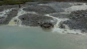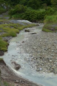 近くの小川では地下からガスや温泉が湧きだしていた。