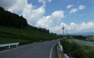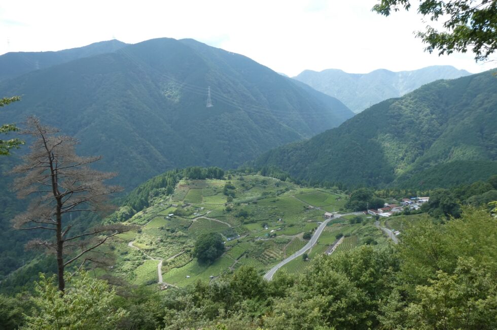 近くの町の茶畑とブドウ畑。ワイン用の品種だった。岐阜県池田町。