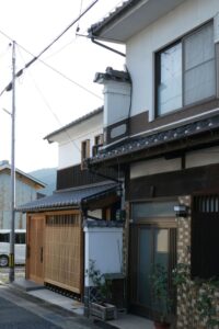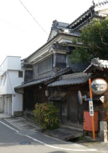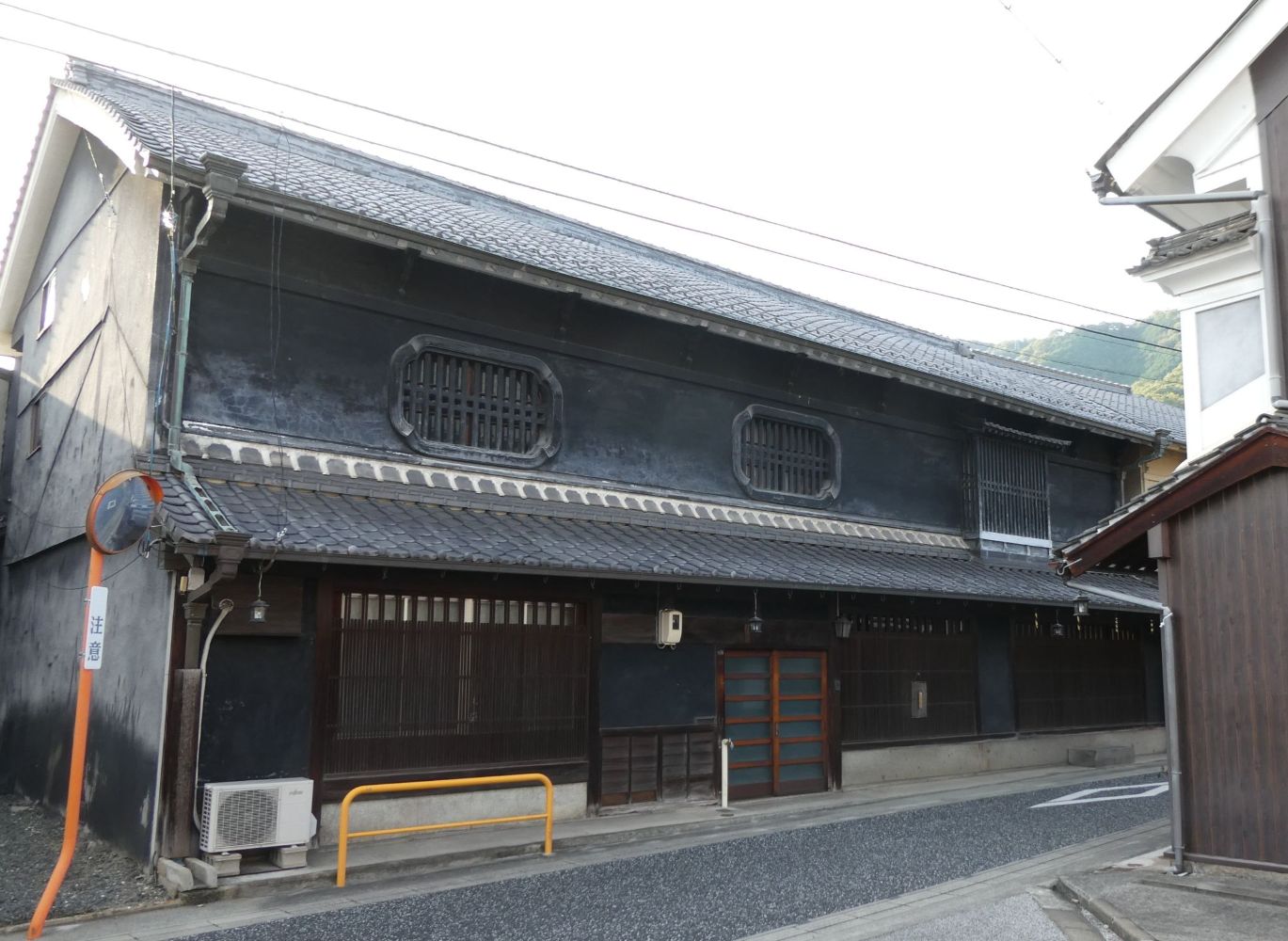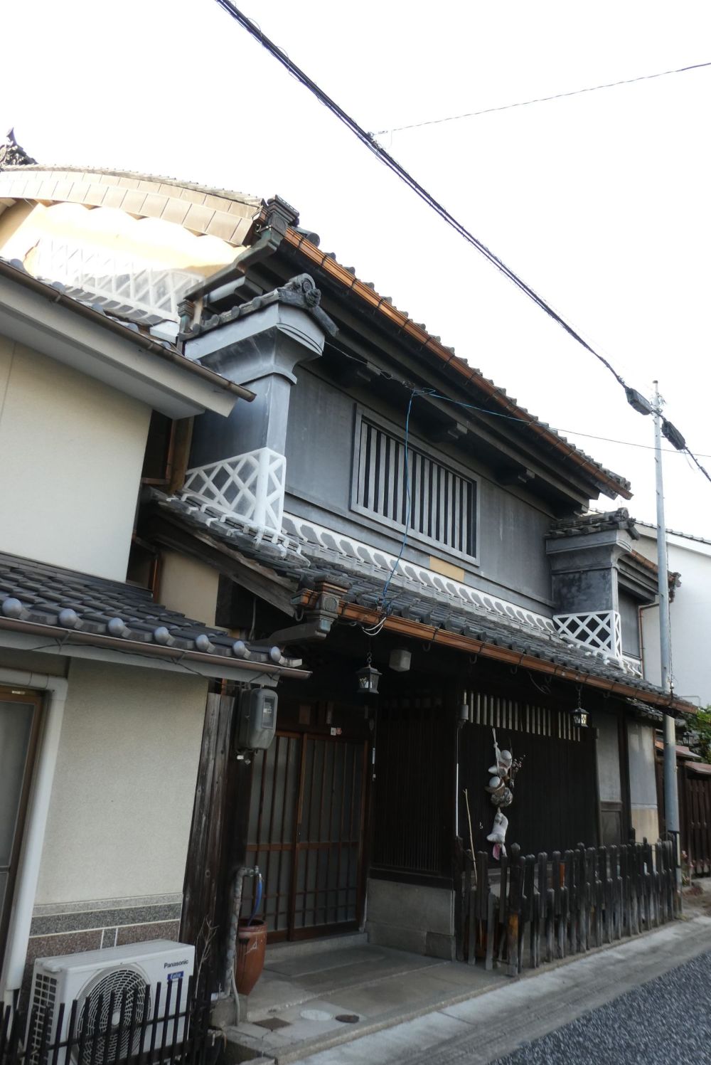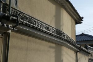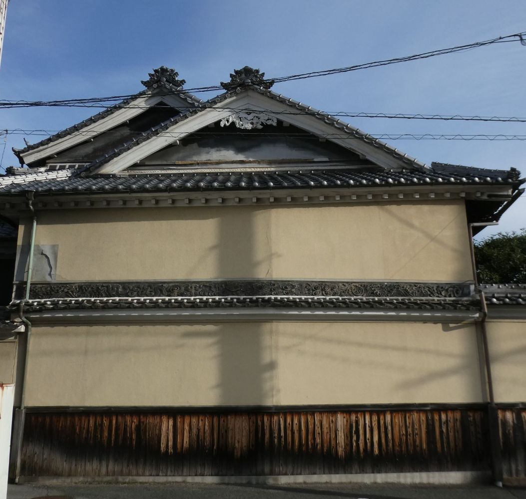 袖うだつのある家。二階の屋根に続く壁の装飾に飾り瓦が使われている。