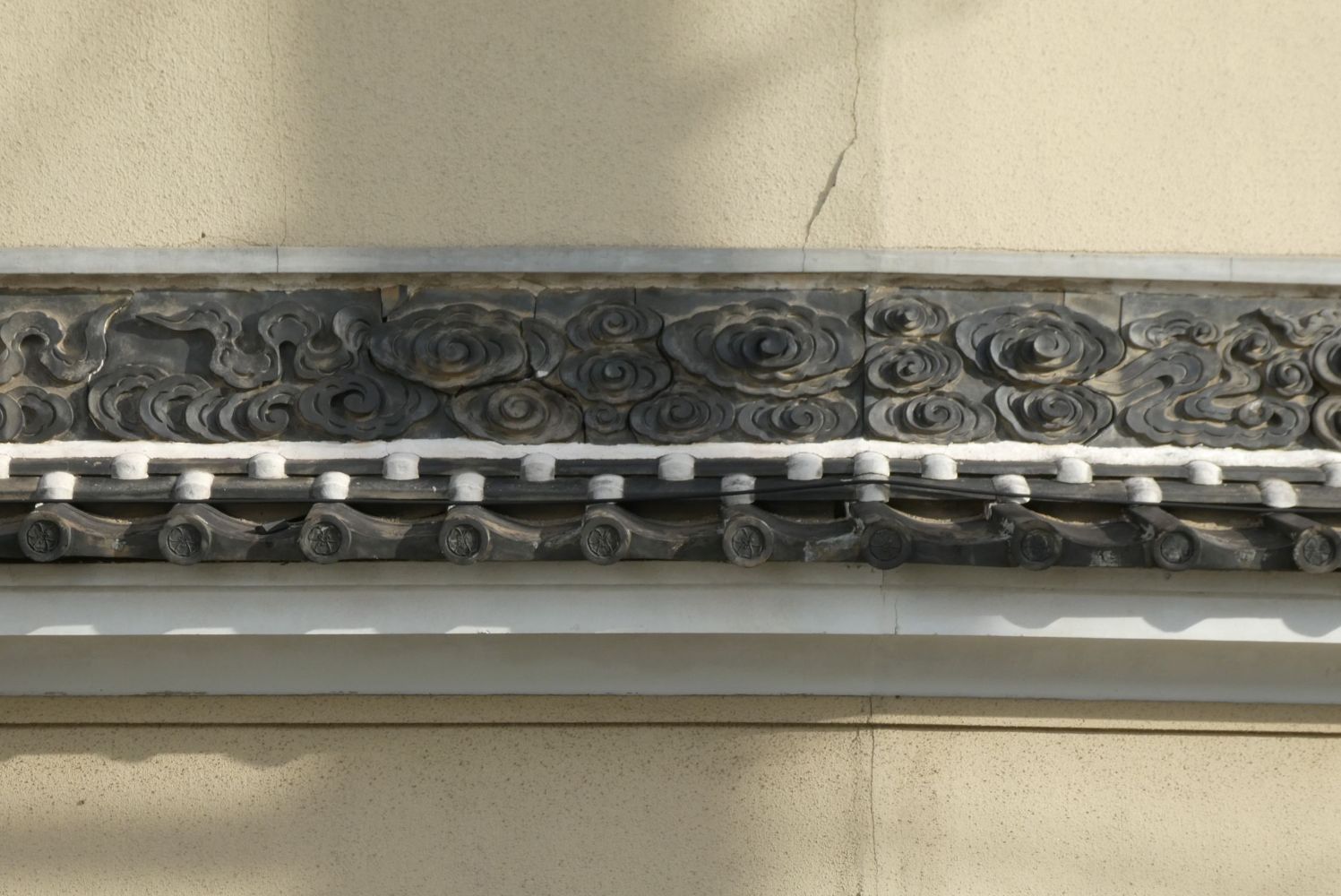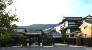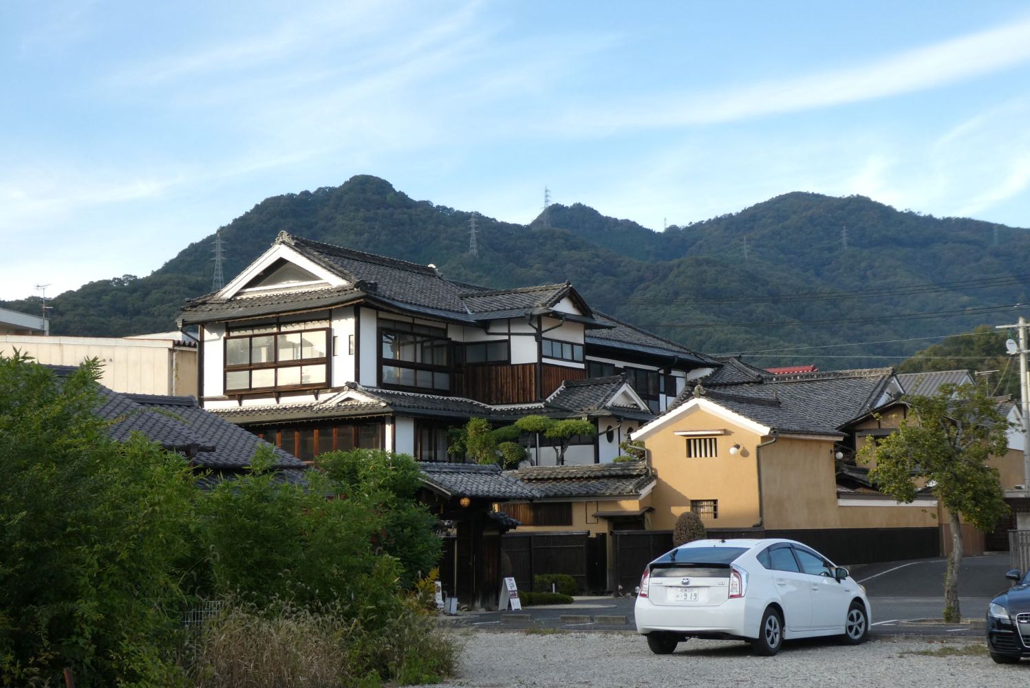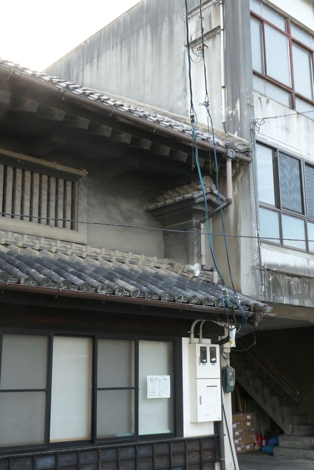 袖うだつのある家。二階の屋根に続く壁の装飾に飾り瓦が使われている。