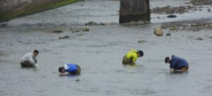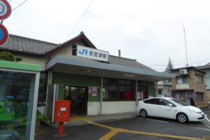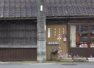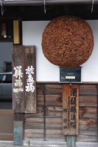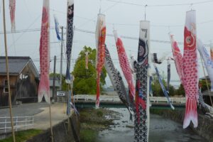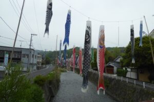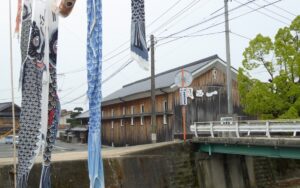 4月後半に訪れたので、川に鯉のぼりが飾られていた。鯉のぼりの向こうには酒蔵も見える。