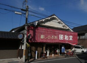 赤い看板が目立つ看板建築の昭和堂