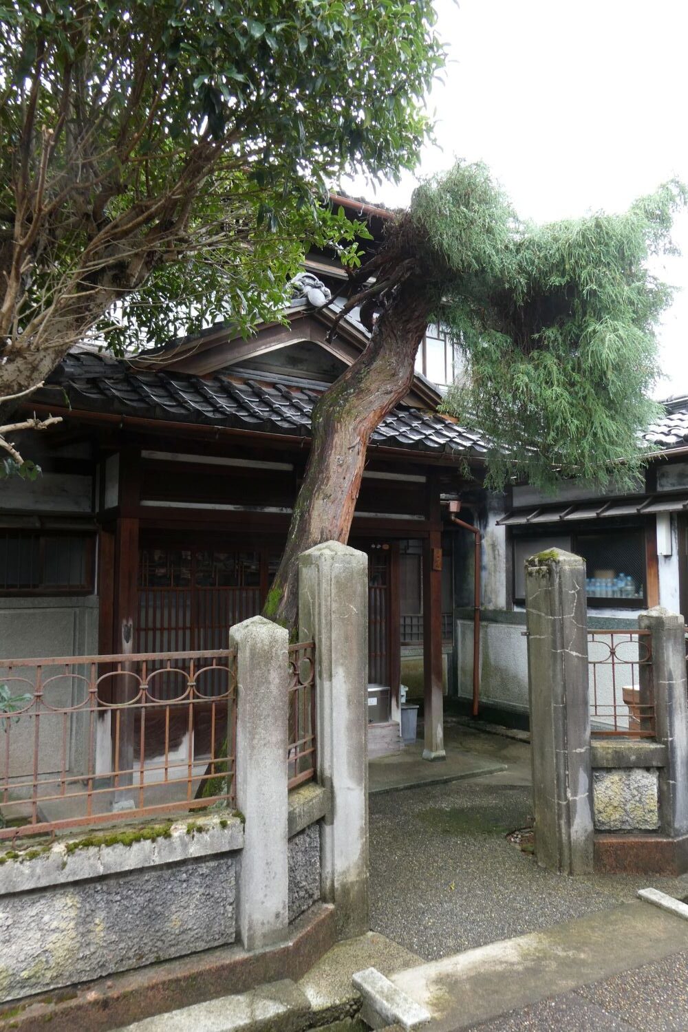 隣家との間の防火壁に瓦が載っていてうだつのように見えた。