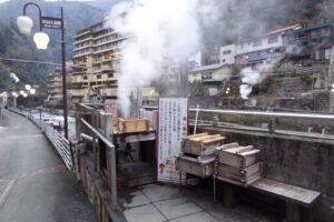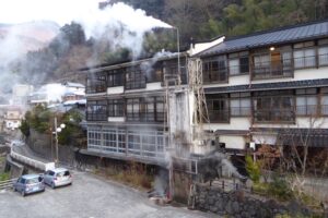 九州には昔からある天然の温泉地が多いが、杖立温泉もそのひとつだ。病気の人が元気になって杖を置いて帰るところからこの名がついたという。