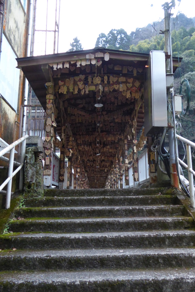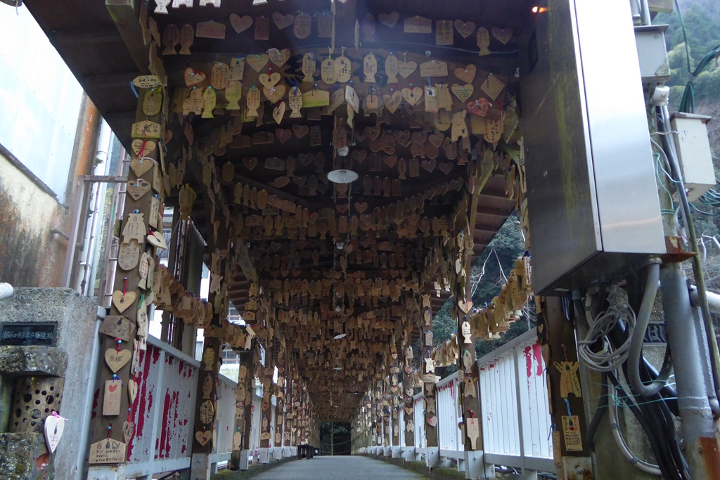 川に架かるもみじ橋にはたくさんの絵馬が吊られていた。