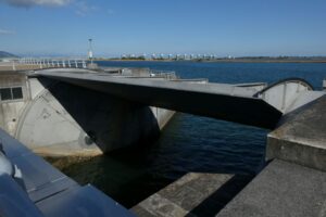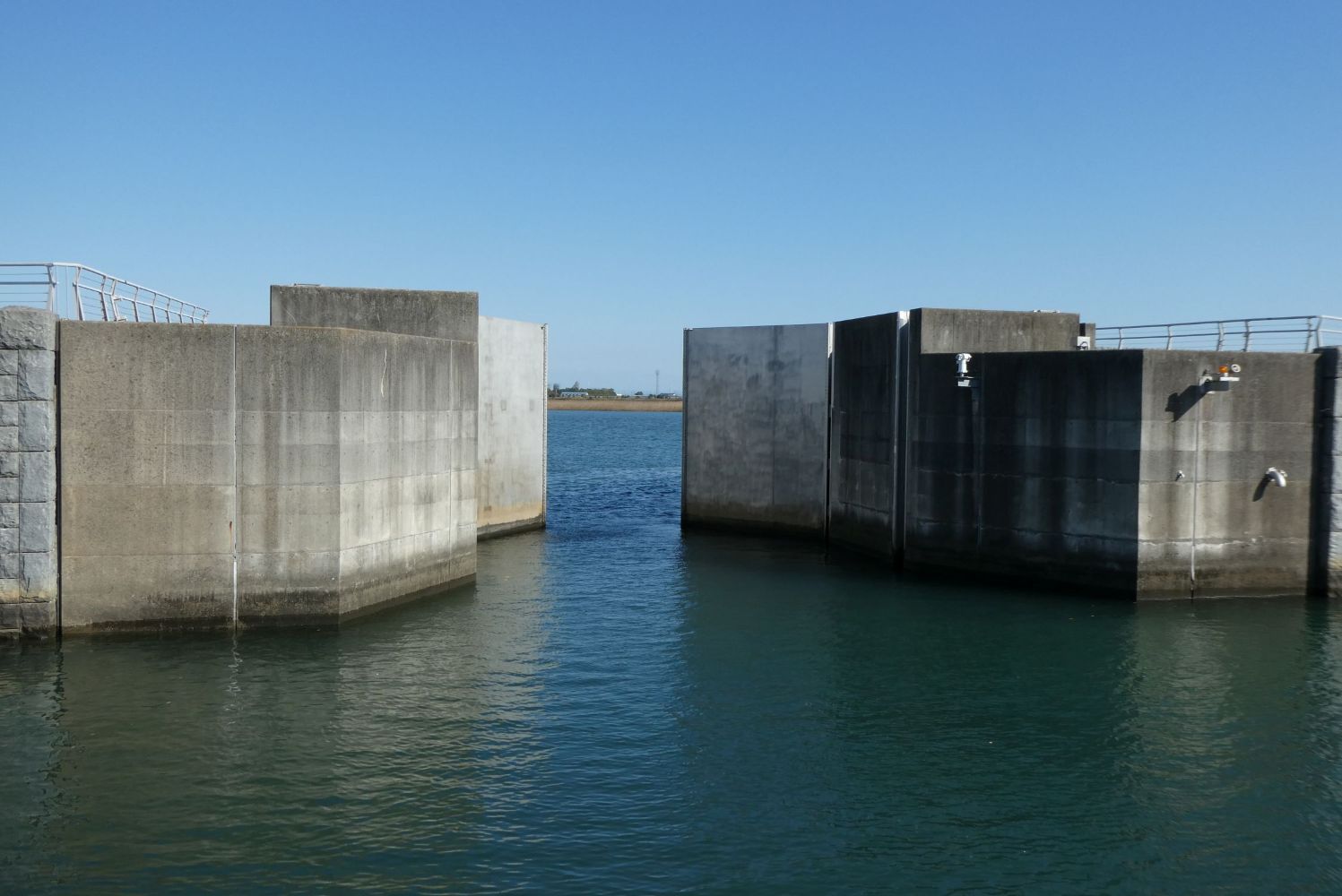 七里の渡しの船着場だったところには現在は堤防が築かれている。その堤防には水門があり、水量の調整のために開け閉めが行われている。ちょうど門を閉めているところだったので、下の写真で様子が分かる。