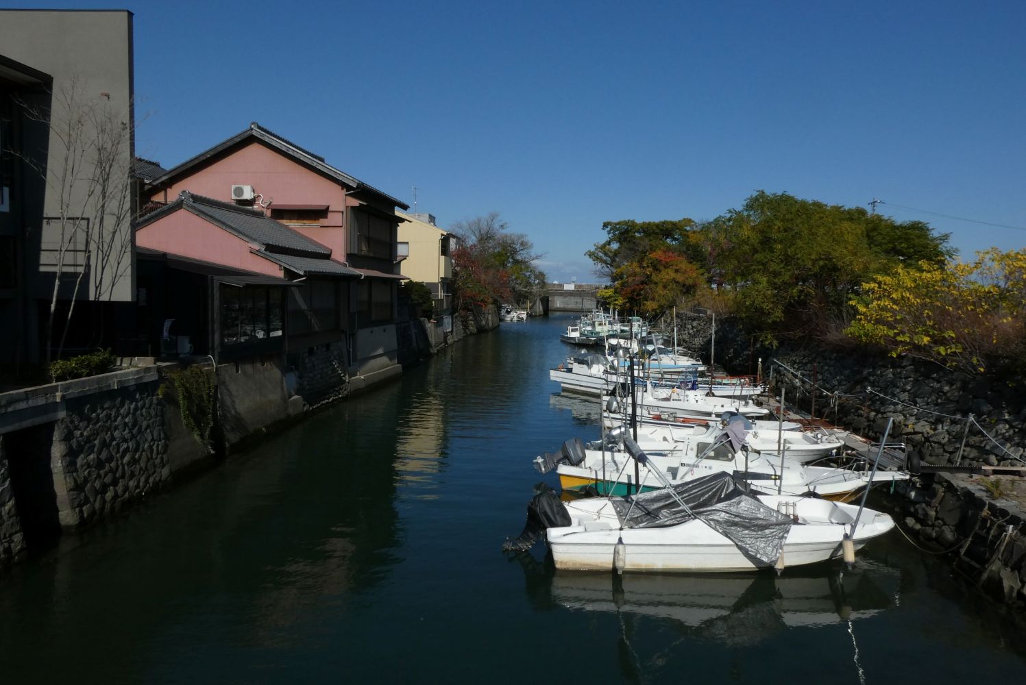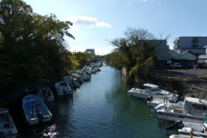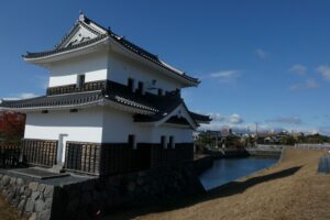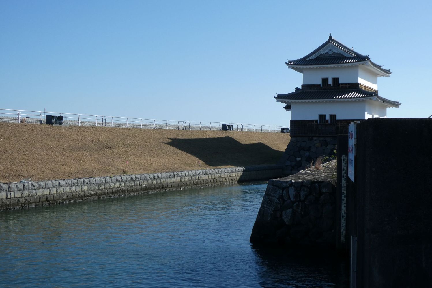 七里の渡し跡。今は堤防があって海には出られない。お城のような櫓が建っているが、水門の管理をする事務所が入っていいた。