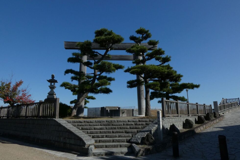 2025年11月。 桑名宿七里の渡しに建てられた伊勢神宮一の鳥居。 三重県桑名市船馬町。
