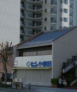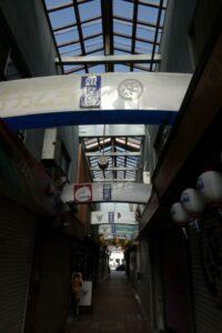 駅前の狭い商店街。手作りのアーケードで覆われている。