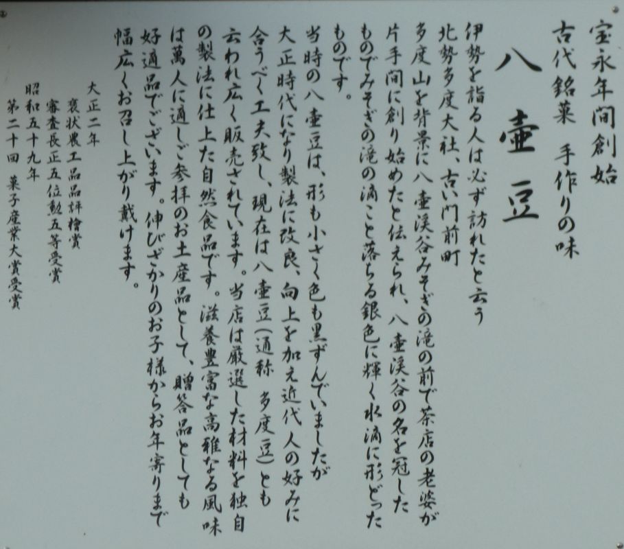 桔梗屋は多度駅から多度大社へ向かう参道にある和菓子屋さんだ。八壺豆が名物だそうだ。残念ながら私が行ったときには閉まっていた。見た感じでは閉業されたのかもしれない。八壺豆そのものは他のお店のものが参道の別のお店で売られていた。