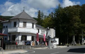 お土産物屋さん専女八幡の建物も目を引く。お隣はニデックオルゴール記念館すわのね。