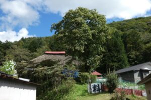 半鐘の向こうに藁葺きの家が見える。