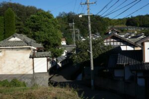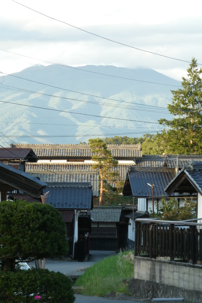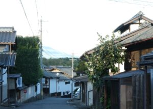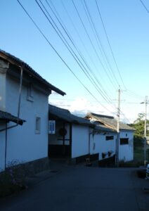 武重本家酒造のあたりの町並み。信州らしく向こうに高い山がそびえている。