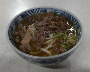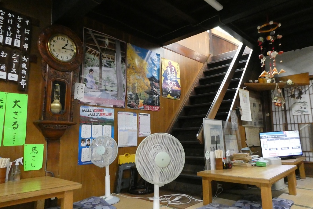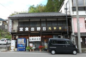 日野出食堂。レトロな雰囲気の食堂だった。馬肉が名物だと言うので、馬肉そばをいただいた。