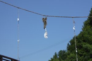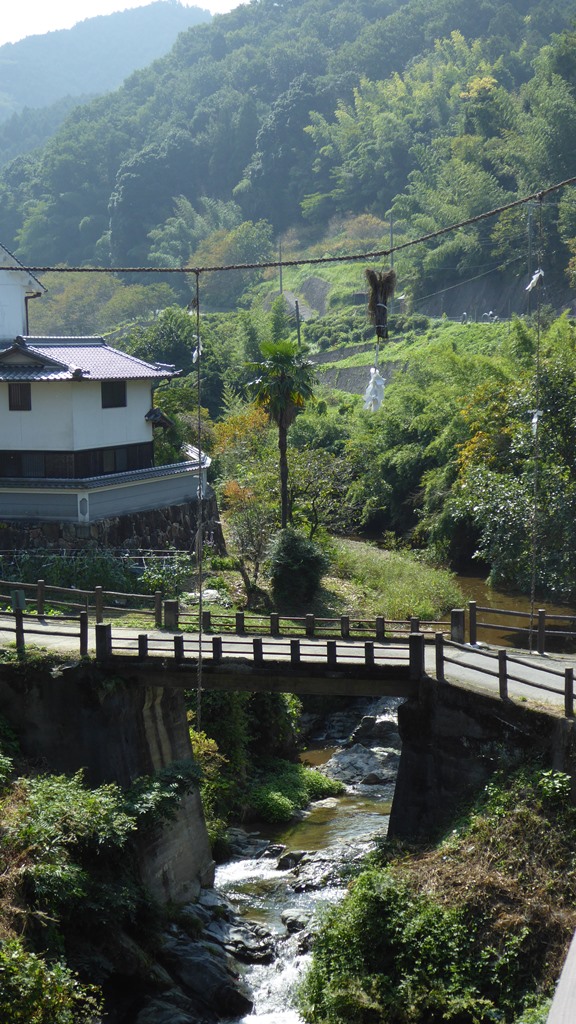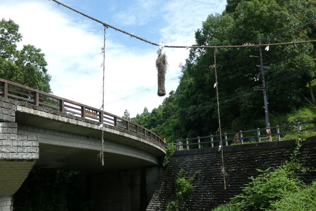 飛鳥川に掛かる綱。綱掛神事というのが行われ、雄のしめ縄と雌のしめ縄が川に掛かっていた。神事は1月に行われるらしいが、綱は一年中あるようだ。こちらは雄綱。