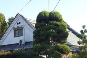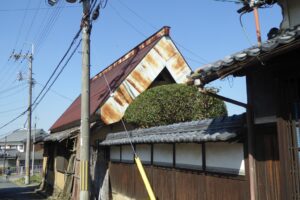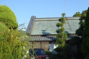 さらに離れた場所で見かけた大和棟の建物。スレートに葺き替えられている。
