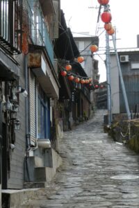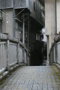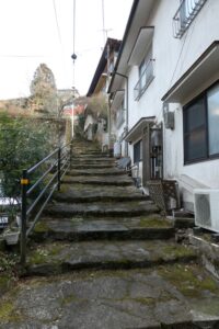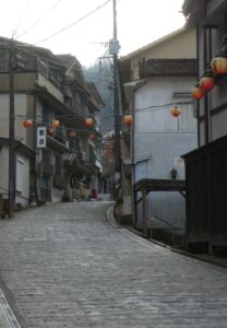 急な坂道沿って昔ながらの温泉旅館が立ち並んでいる。