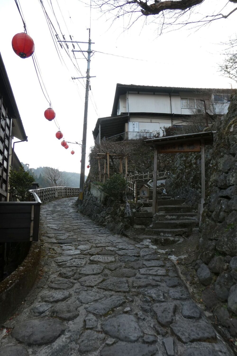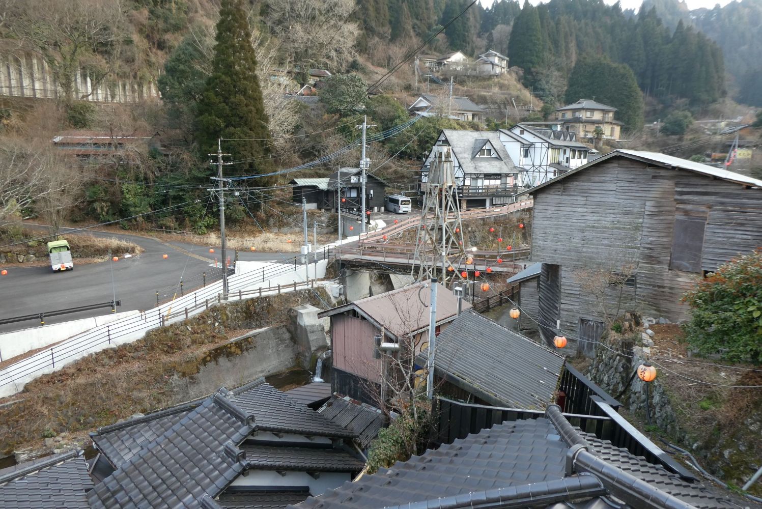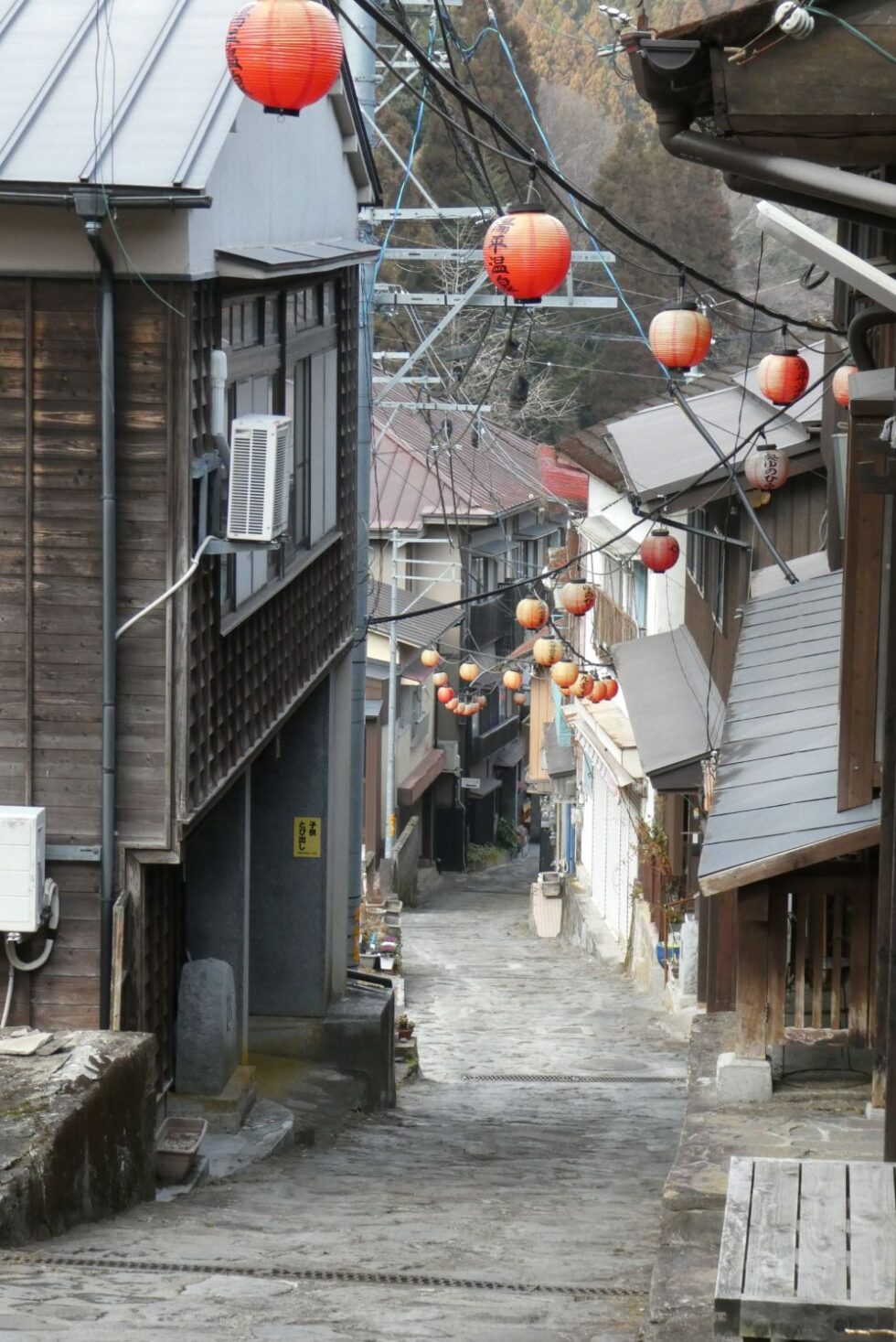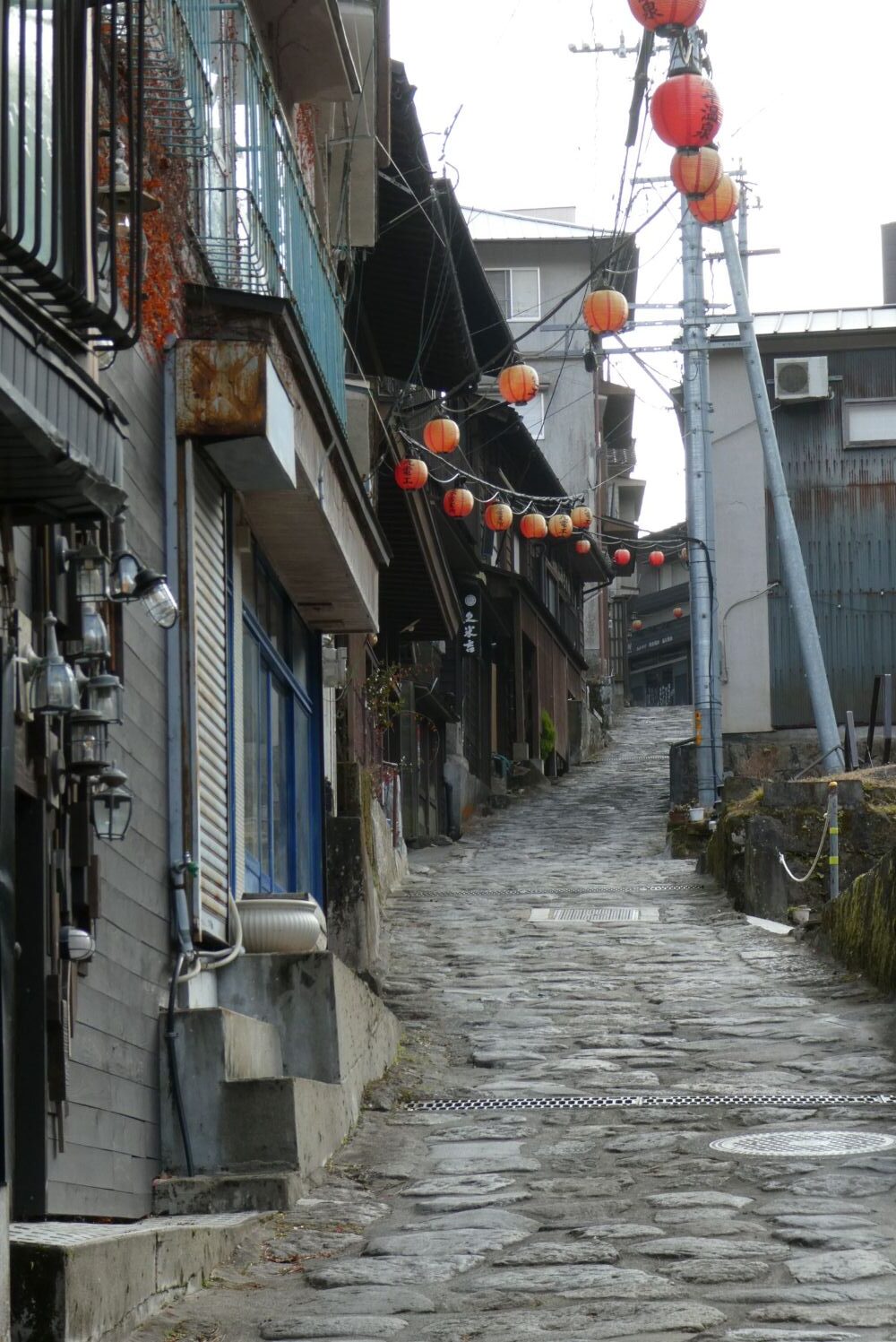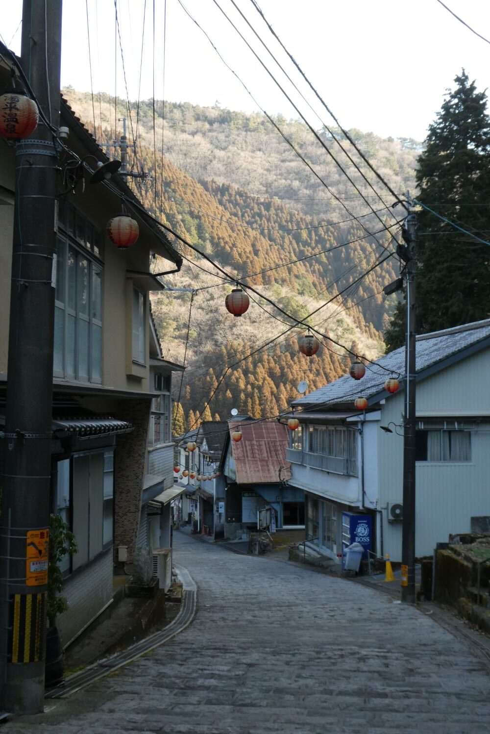 急な坂道沿って昔ながらの温泉旅館が立ち並んでいる。