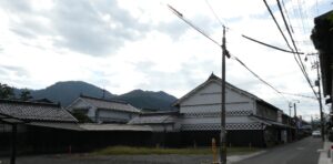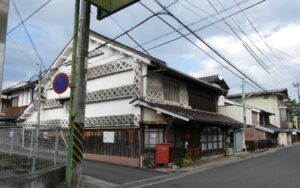 2024年9月。 妻側に見事ななまこ壁の装飾のある町家。 岡山県真庭市久世。