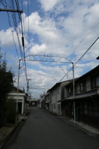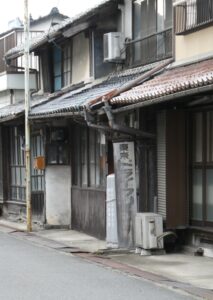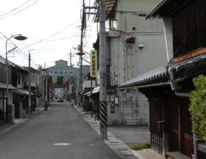 久世の町の古い町並みはJR久世駅から遷喬小学校に向かう道に大きな民家が数軒並んでいる。そことは別に出雲街道沿いの昔の商店街に古い町並みが残っている。駅から遷喬小学校に向かう通りは(1)にまとめた。こちらの(2)では出雲街道沿いの町並みを紹介したい。