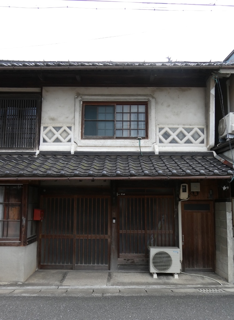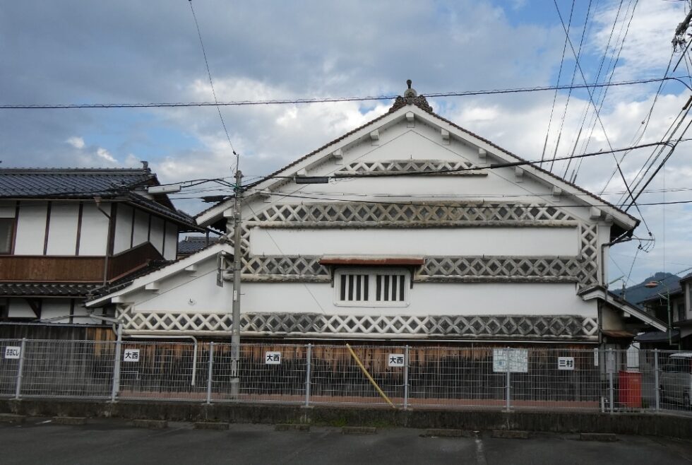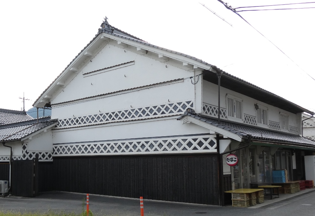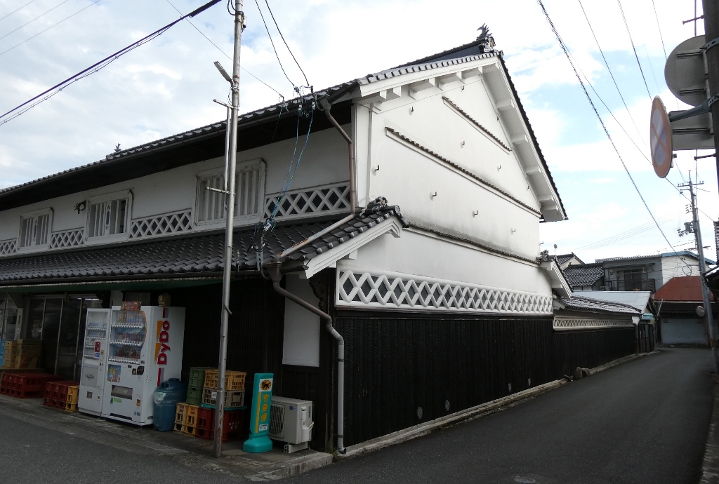 2024年9月。 妻側に見事ななまこ壁の装飾のある町家。 岡山県真庭市久世。