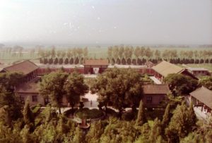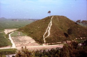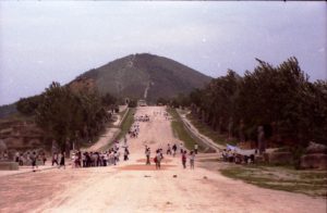右側の建物は墓への入口。そこから小山のような陵の下まで急な下り坂のトンネルが掘ってあって、お墓の内部を見ることができる。トンネルの両側には壁画があり、天平時代のような色彩画が描かれている。本物なら素晴らしい。(1984年)