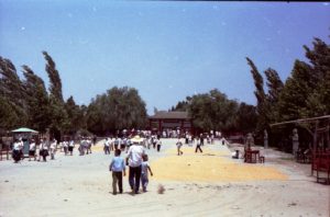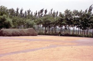 中国では、ちょうど米の収穫時期にあたっていた。田植えの光景も目にしたから、二期作なのだろう。脱穀したもみの乾燥はもっぱら道路で行われる。アスファルト舗装の道の両側にはもみが拡げられ、それをバスやトラックが踏んで通る。あまり散らばらないように時折拡げ直して、夕方にはほうきで集めて袋に詰める。観光地の駐車場も、参道も大いに利用されている。西安郊外の観光地では当たり前の風景だ。(1984年)