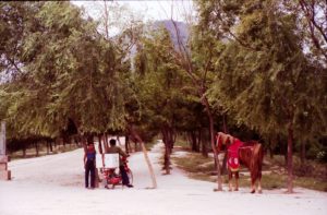 西安の人たちは商売熱心である。人里離れた感のある乾陵までオートバイでアイスクリームを売りに来る。この青年の売るアイスキャンデーは少し大きめで値段は普通の倍、1角であった。余程よく稼ぐのか赤いバイクに誇らしくまたがっている。他にはバイクに乗ったアイスクリーム屋は見かけなかった。皆、自転車の後ろに木の箱を積んで、布団で保温して運んで来る。他に冷たいものがない中国ではこのピングォーのお世話になりすぎて、西安では下痢をしてしまった。