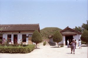 右側の建物は墓への入口。そこから小山のような陵の下まで急な下り坂のトンネルが掘ってあって、お墓の内部を見ることができる。トンネルの両側には壁画があり、天平時代のような色彩画が描かれている。本物なら素晴らしい。(1984年)