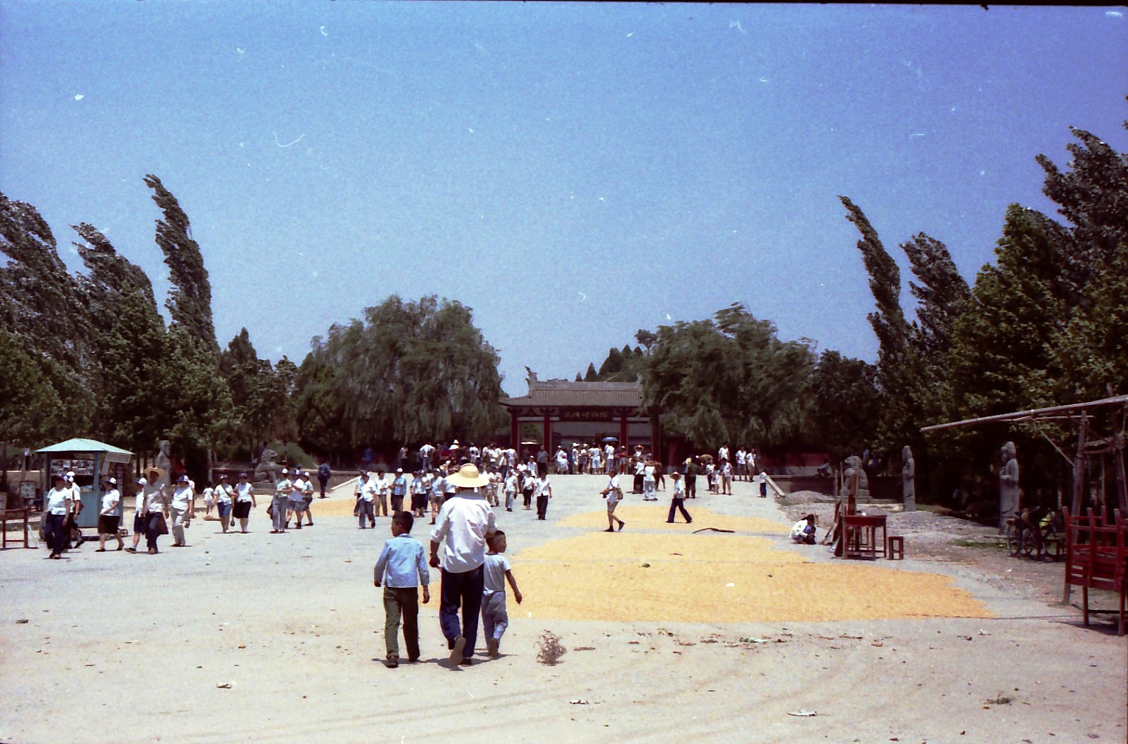 中国では、ちょうど米の収穫時期にあたっていた。田植えの光景も目にしたから、二期作なのだろう。脱穀したもみの乾燥はもっぱら道路で行われる。アスファルト舗装の道の両側にはもみが拡げられ、それをバスやトラックが踏んで通る。あまり散らばらないように時折拡げ直して、夕方にはほうきで集めて袋に詰める。観光地の駐車場も、参道も大いに利用されている。西安郊外の観光地では当たり前の風景だ。(1984年)