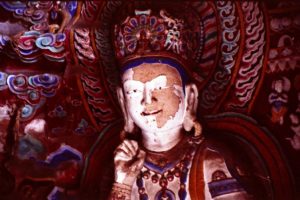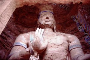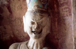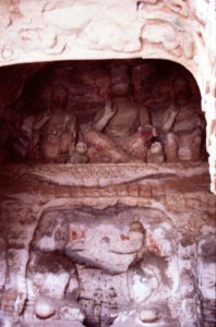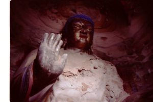 仏像を塗り替えるのは現代中国だけではない。ここの仏像も清代に一度修復しているという。ところどころに空いている穴はその時クサビを打った跡だ。そのクサビを中心に上からしっくいを塗り、その上から彩色したという。(1984年)