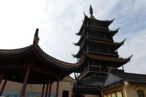 入り口のすぐ向かいにある商店のビル。中国の伝統的な建築を近代的なビルの中に取り入れている。