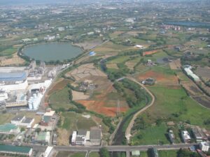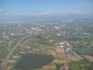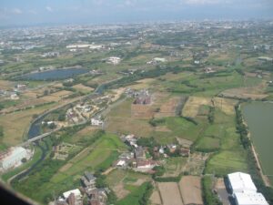 桃園空港を飛び立った飛行機からみた桃園付近。2009年8月。