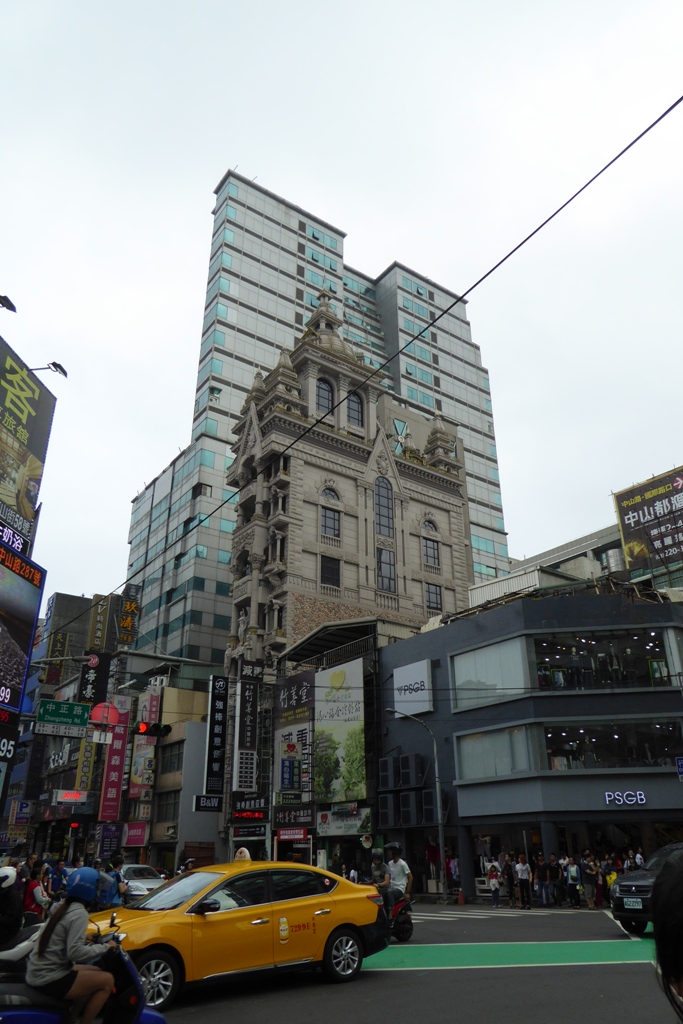 近代的な高層ビルの手前に意匠を凝らしたレトロ風なビルがあった。2015年