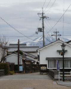 2025年1月。 朝日町の町並みの向こうに伊吹山が見える。 滋賀県長浜市朝日町。