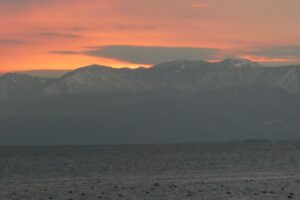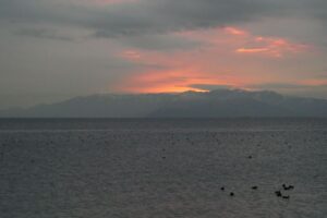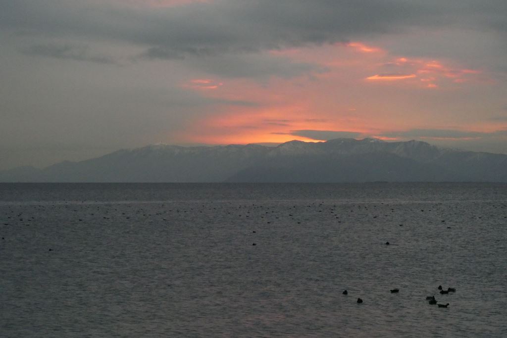 豊公園から見る琵琶湖の夕景。対岸に見えるのは比良山系だろうか。
