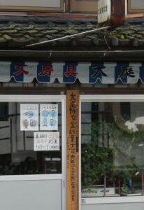 大庭博文堂。文房具と履物のお店のようだ。店主の注意書きが面白い。大正六年の創業と書かれている。