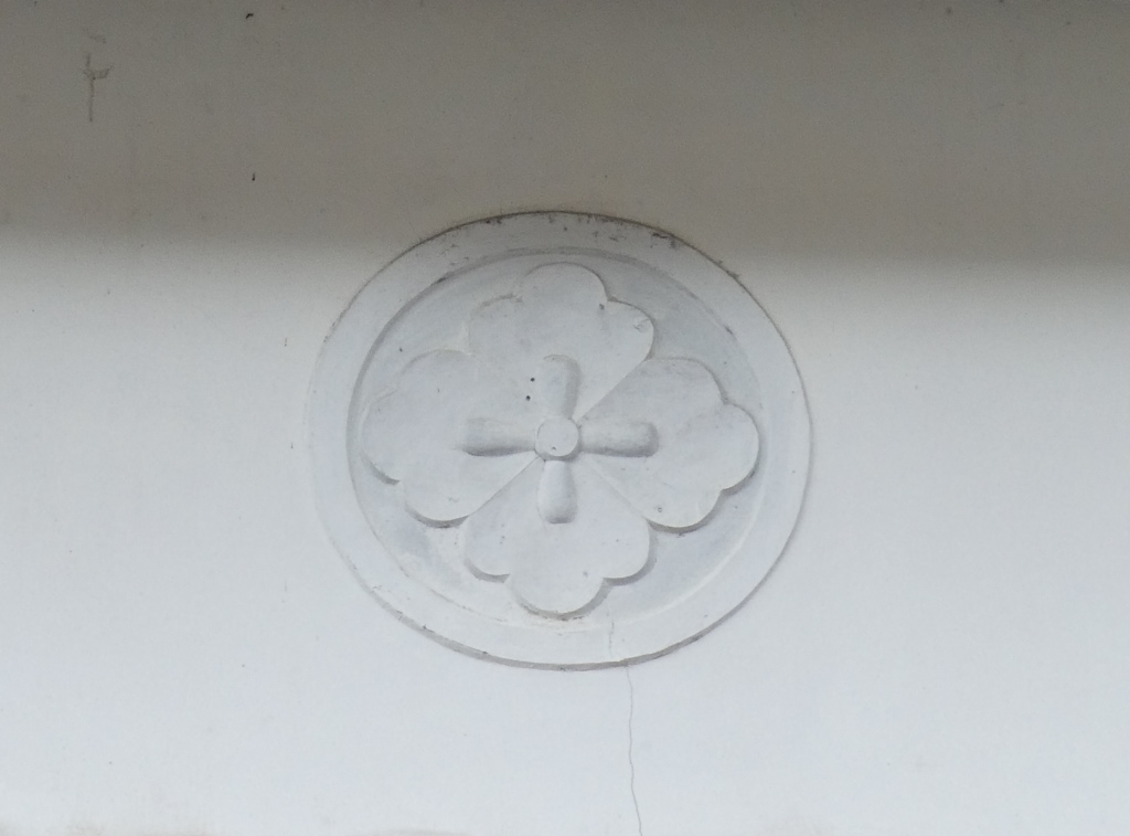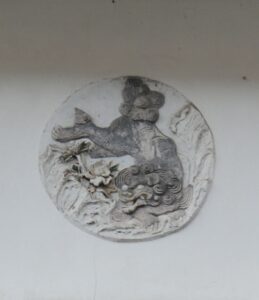 つし二階の壁の鏝絵が印象的だ。獅子と家紋でしょうか。