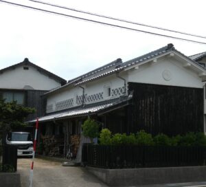 なまこ壁の大きな蔵。薪が積まれていた。