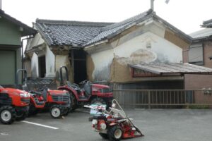 丸畑組。妻の壁に漆喰で書かれている。「野上二番」は野上町の名残り。その前の「テ」は何? 郵便番号の記号と同じだが辻褄が合わない。電話と言う意味なのは分かるが謎が残る。