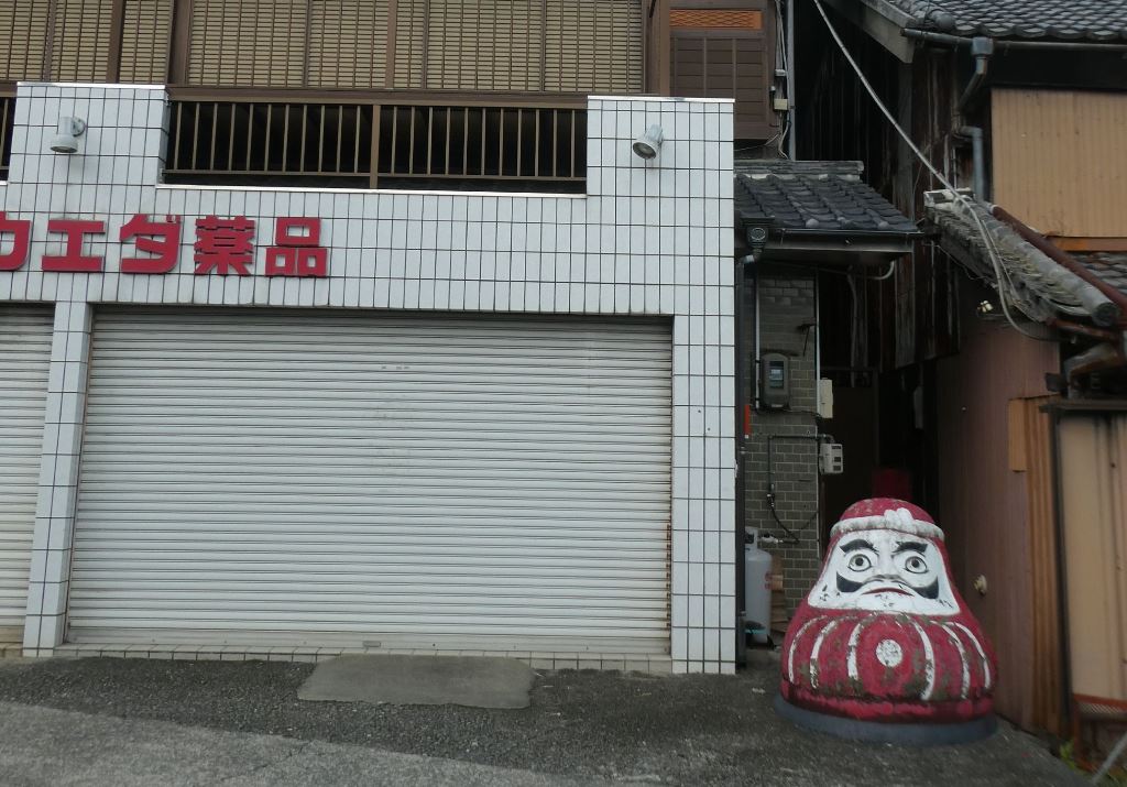 コンクリート製の大きなだるまが店先に作り置きされていた。