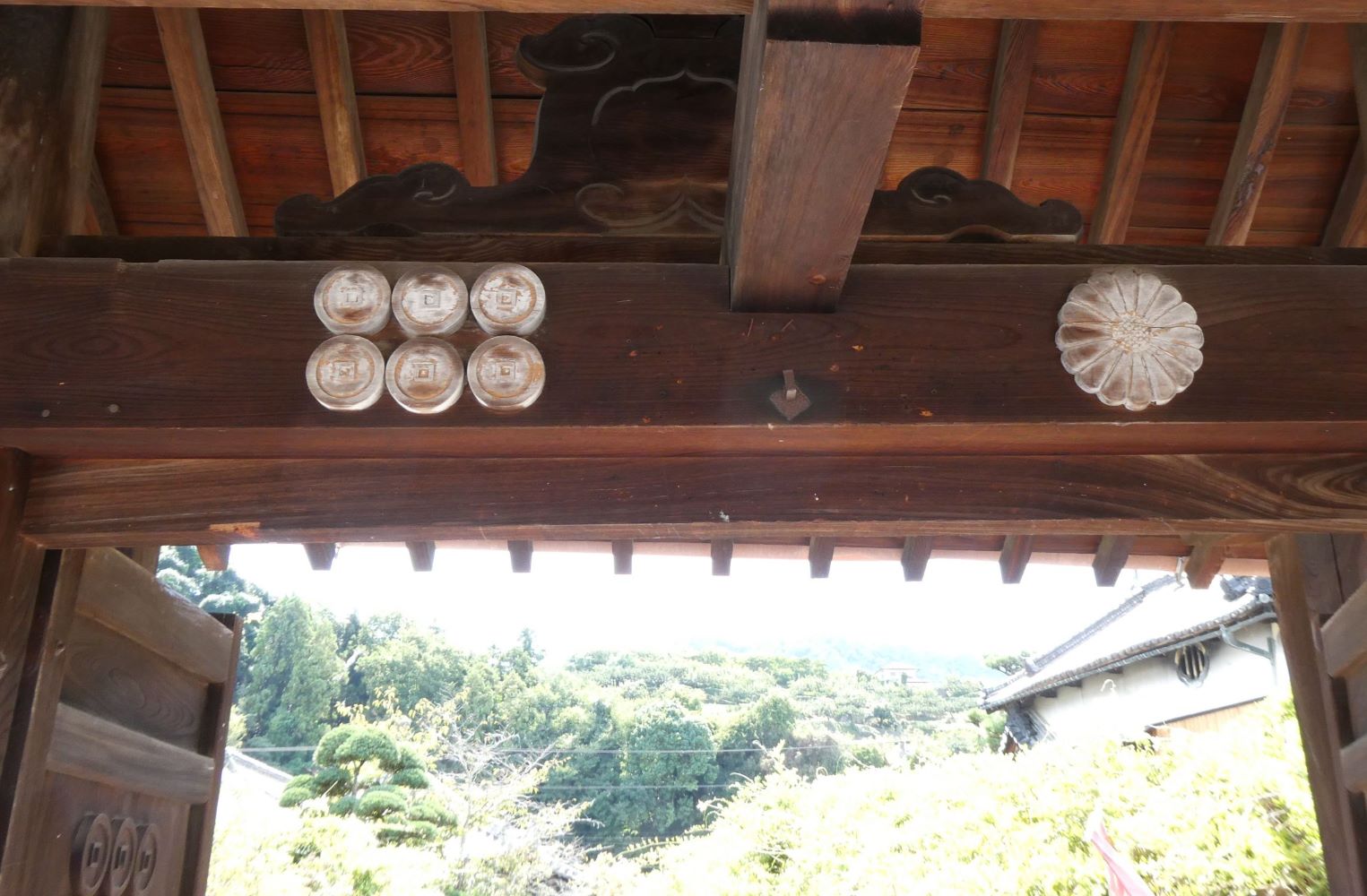 真田庵、真田幸村父子の屋敷跡に建てられたお寺、善名称院。山門には真田の六文銭と菊の御紋がある