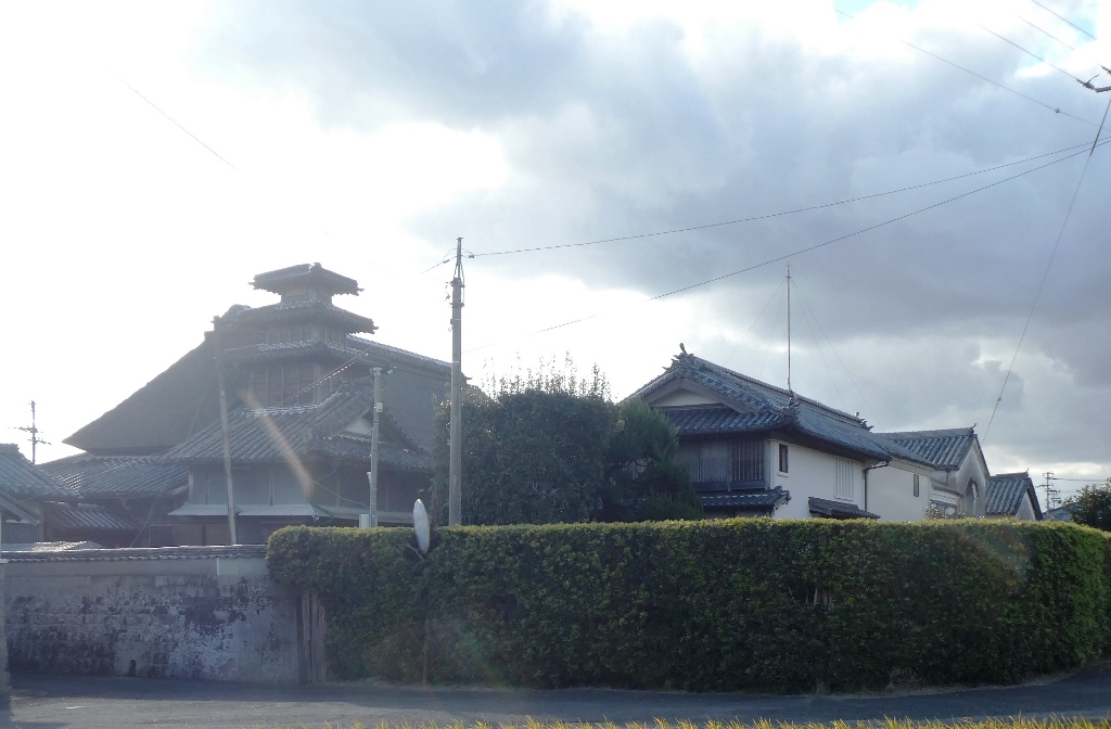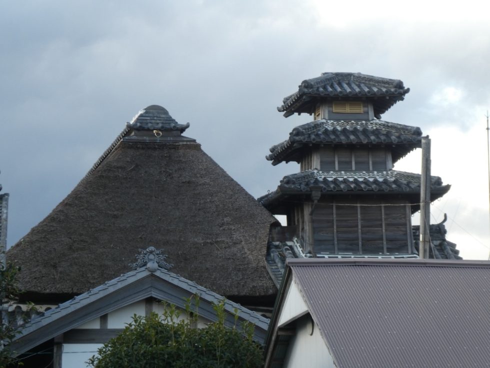 車窓から大きな蔵を見つけて立ち寄った。田んぼに囲まれて大きな邸宅が立っていた。主屋には藁葺き屋根の家があり、その横に不思議なお城のようなものもあった。